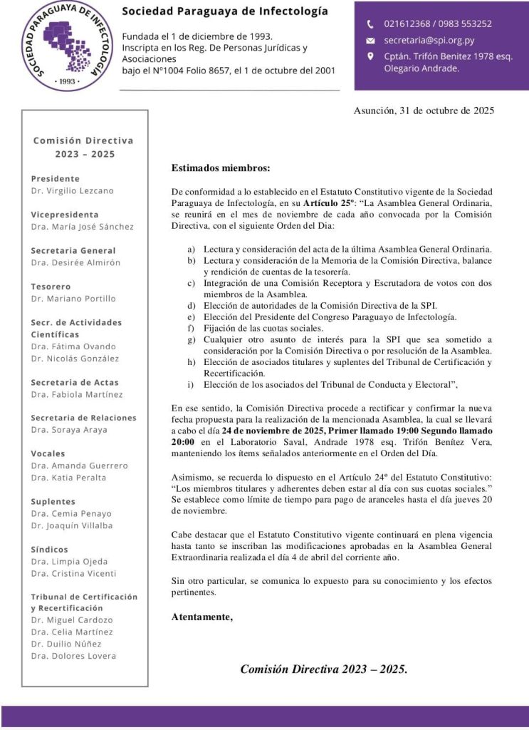 De conformidad a lo establecido en el Estatuto Constitutivo vigente de la Sociedad Paraguaya de Infectología…